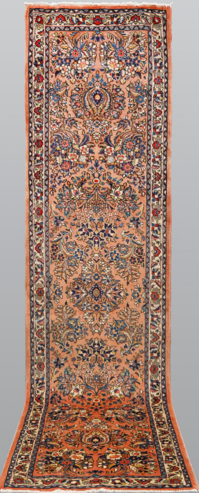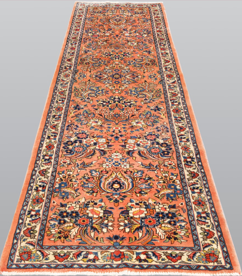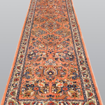 Hand-knotted in Western Iran, this authentic Hamadan runner features a warm terracotta field enriched with traditional floral motifs in indigo, gold and soft ivory tones. Its dense natural wool pile is durable with a gentle sheen, making it an elegant choice for corridors, galleries or refined interiors seeking cultural warmth and sophistication.