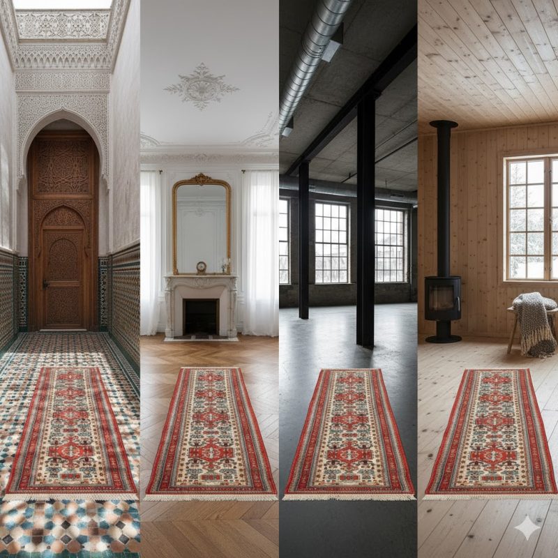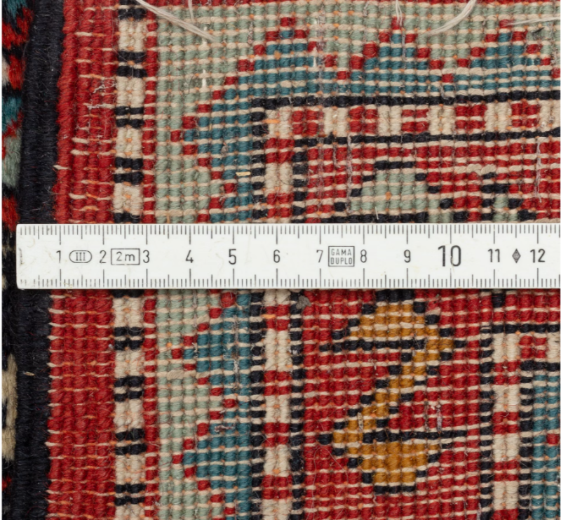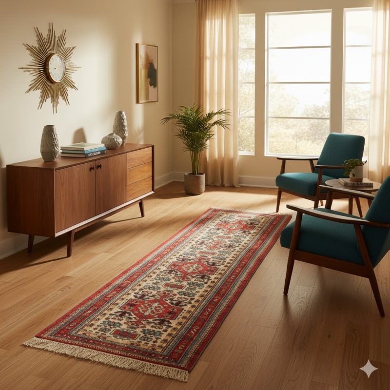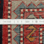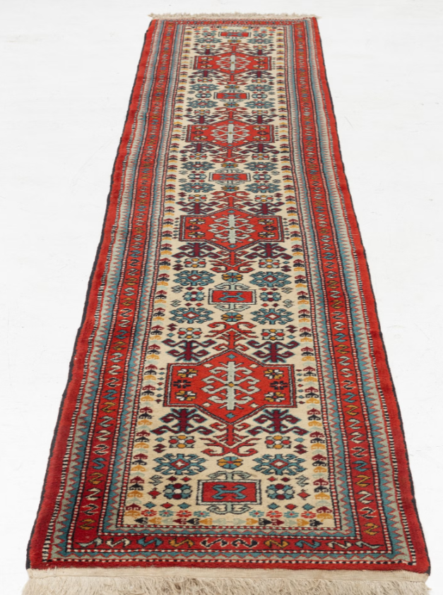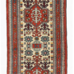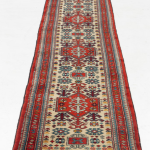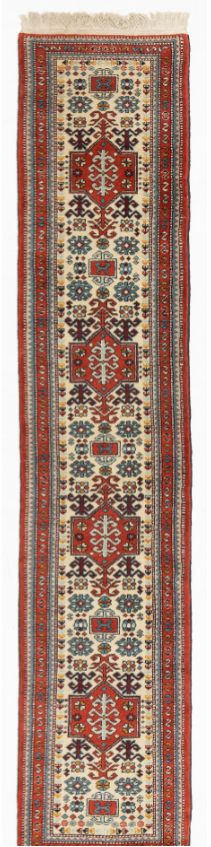 A striking Caucasian tribal runner distinguished by its rhythmic chain of diamond medallions set against a bright ivory ground. The vivid contrast of red, green, and indigo blue reflects the bold artistry of nomadic weaving traditions. Its expressive geometry and cultural authenticity make it an eye-catching statement for eclectic or heritage-inspired interiors.