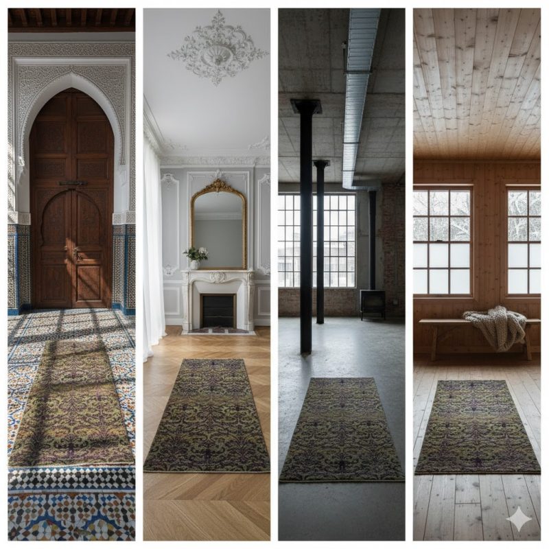 This refined Indian handwoven runner features a classical Mughal-inspired pattern in layered olive, gold, and deep aubergine tones. Meticulously crafted from natural wool, its intricate surface and elegant symmetry offer a sophisticated accent for luxury interiors seeking cultural richness with a calm, mature aesthetic.