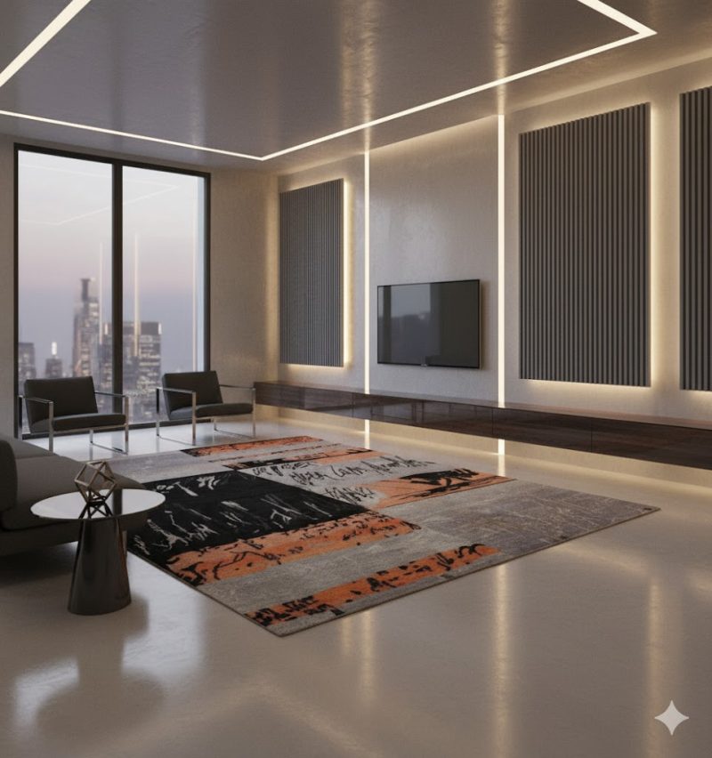 Энэхүү орчин үеийн загварлаг хивс нь хар, улбар шар, зөөлөн саарал өнгөнүүдийн зоримог хослолоос бүрдсэн бөгөөд динамик, тэгш бус хийцтэй.Орчин үеийн гоо зүй нь хийсвэр ландшафт болон архитектурын хөдөлгөөний сэтгэлийг төрүүлж, өндөр зэрэглэлийн интерьерт тохирно. Байгалийн ноосоор мэргэжлийн түвшинд гараар нэхэгдсэн энэ хивс нь гүн, бүтэц, уран сайхны нарийн чанарыг харуулдаг — орчин үеийн пентхаус, галерей, гэр,тансаг загварын орчинд тохиромжтой.