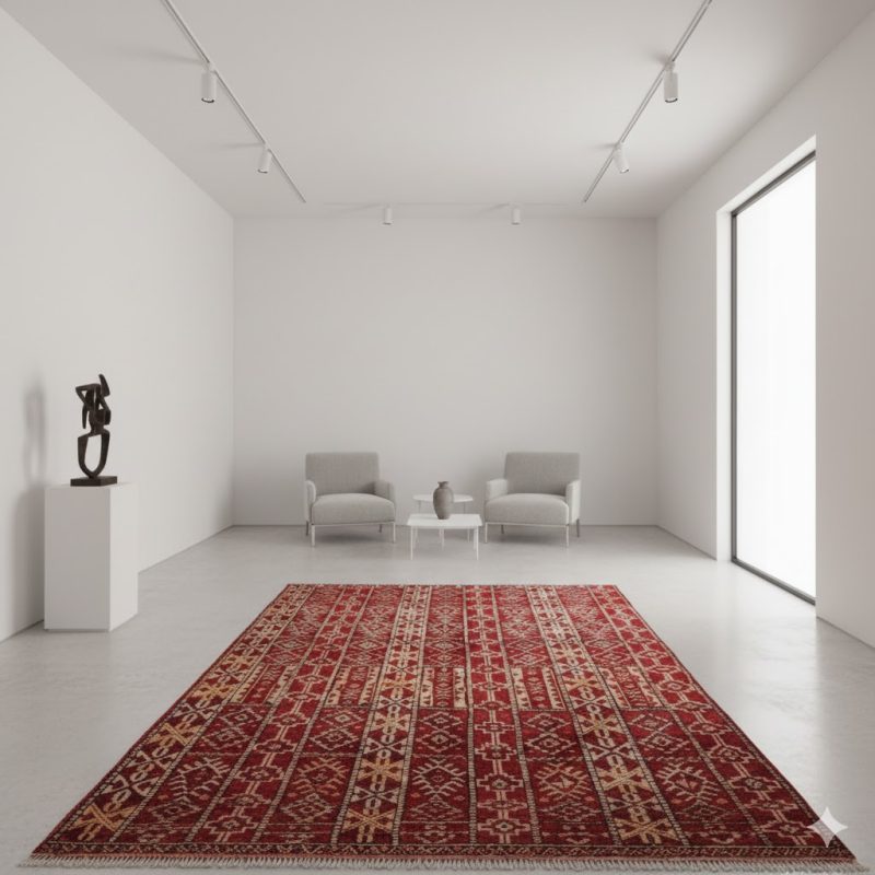 Мароккогийн уламжлалт Амазигын овгийн хивс нь баялаг улаан өнгөний талбайтай бөгөөд босоо хэлбэрийн бэлгэдлийн геометрийн хээний давхарласан найрлага — хээ бүр өвөг дээдсийн хамгаалалт ба түүх ярьсныг илэрхийлдэг. Байгалийн ноосоор гараар нэхэгдсэн энэ хивс нь дулаан, органик бүтэцтэй бөгөөд уран бүтээл төвтэй амьдрах орон зайнаас эхлээд газрын өнгөний тансаг орчин хүртэлх тансаг интерьерт соёлын онцгой хандуур болно.