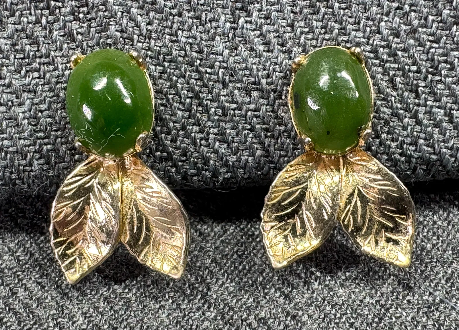 Vintage 12K gold-filled green jade cab leaves screw back earrings 2